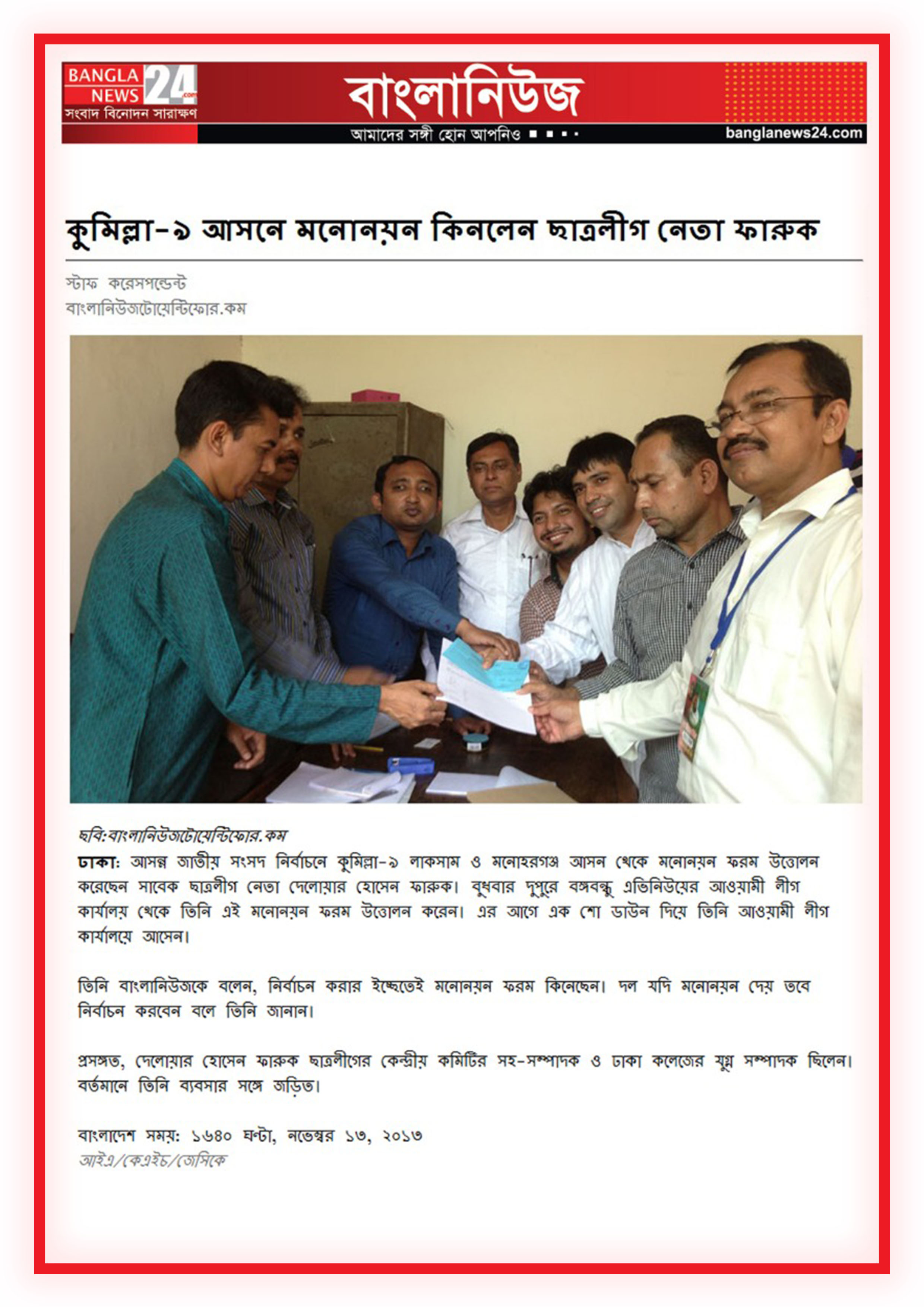 কুমিল্লা ৯ আসনে মনোনয়ন কিনলেন ছাত্রলীগ নেতা ফারুক